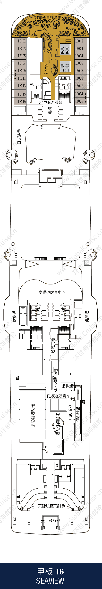 楼层:16容纳:消费:免费328平方米的健步道绕船而建。客人可以在享受大海全景的同时散步、慢跑或跑步。这条赛道主要是为迎合喜爱健身的客人而建。