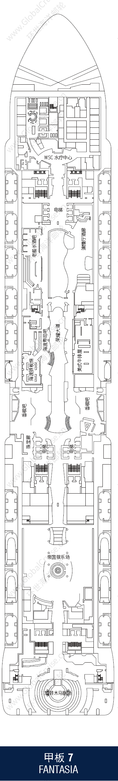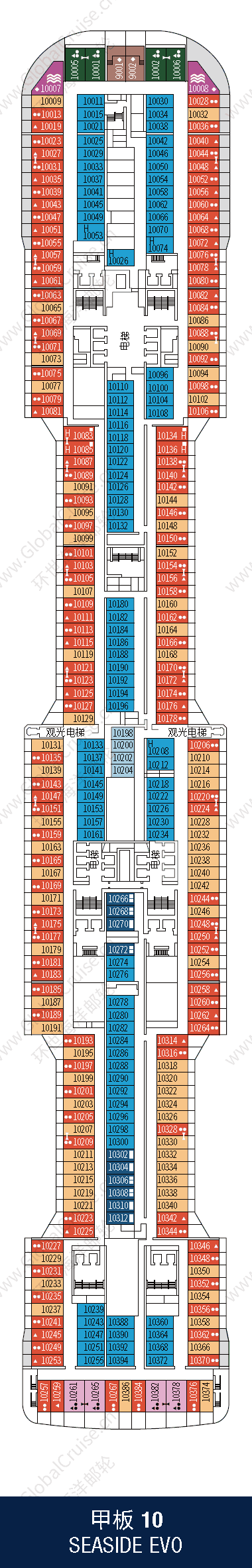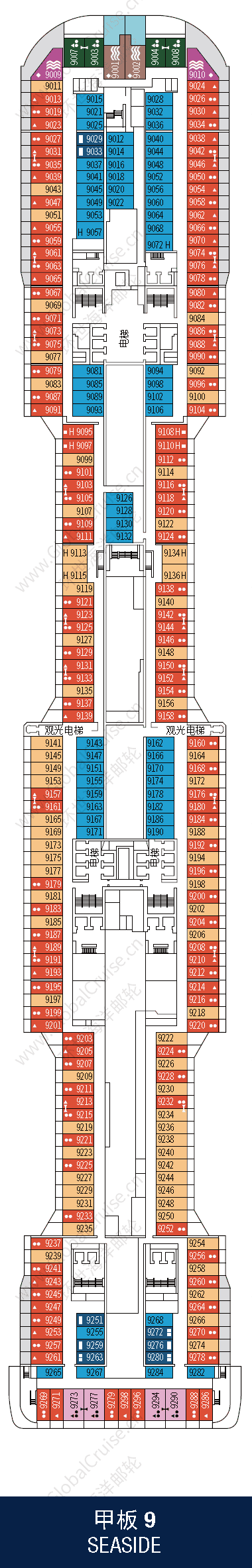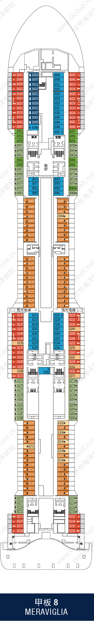 位于八楼,在船中、船尾有少部分房间,在靠船前半部和OM2穿插了一些房间,这些房型主要这受7楼救生艇的遮挡。