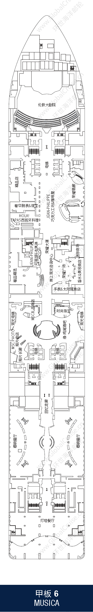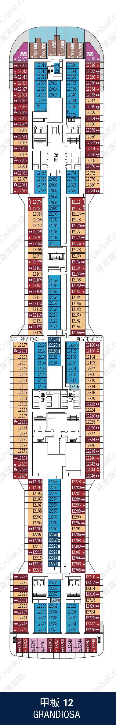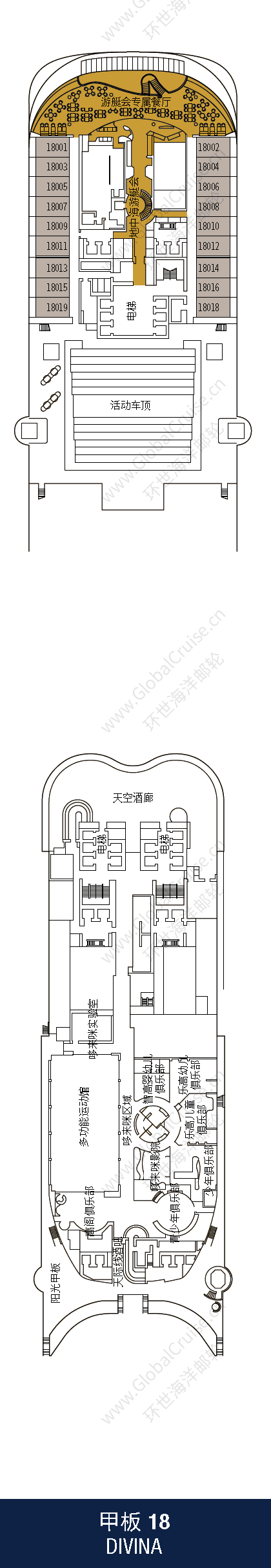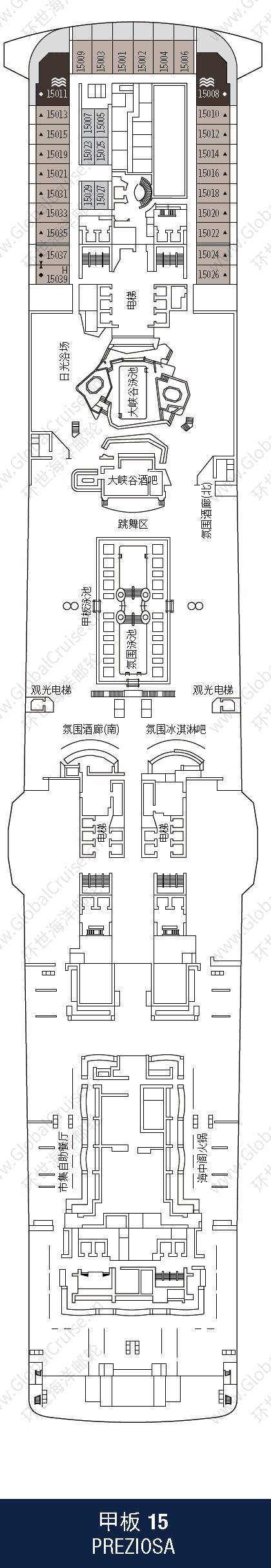 位于八楼,在船中、船尾有少部分房间,在靠船前半部和OM2穿插了一些房间,这些房型主要这受7楼救生艇的遮挡。
