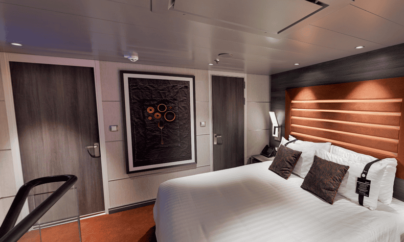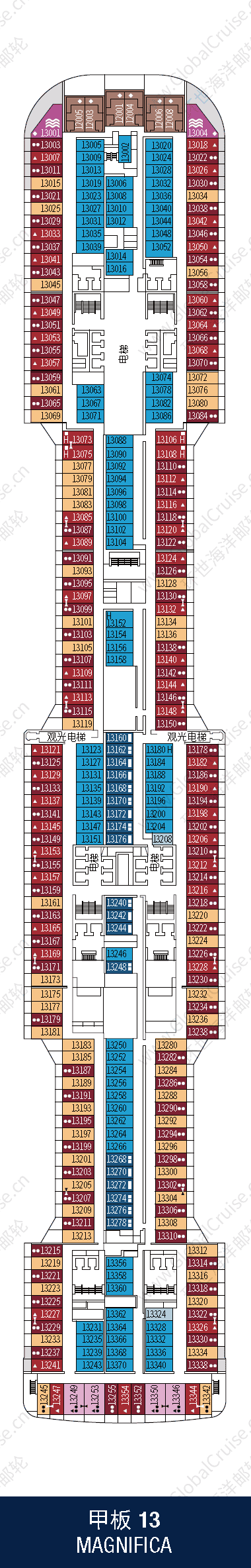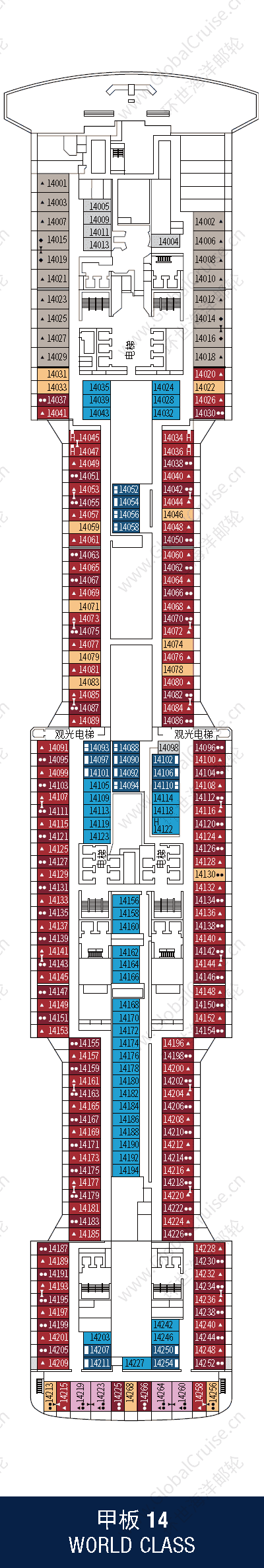 位于13楼和14楼各有2间,13245、13342以及14213、14256号,都在船尾的两边,只允许1人入住,房间内只有一张上下双层床。