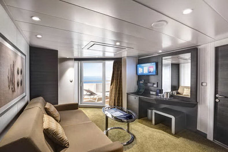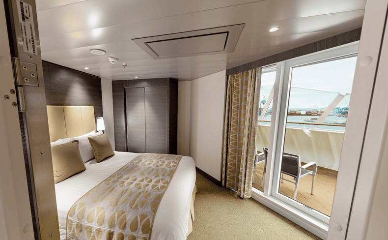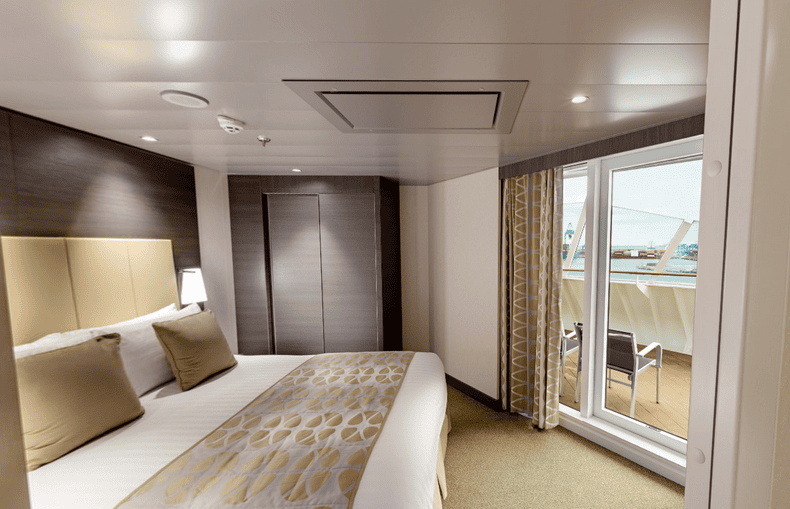 房间有一张双人沙发床供第3~4人入住,房间正处90°转角处,所以阳台面积相当大。船尾位置为弧形,所以这几个房间面积和阳台面积数据有小小出入,房间阳台不是玻璃,而是半包围的金属围栏。有带按摩浴缸的大阳台。