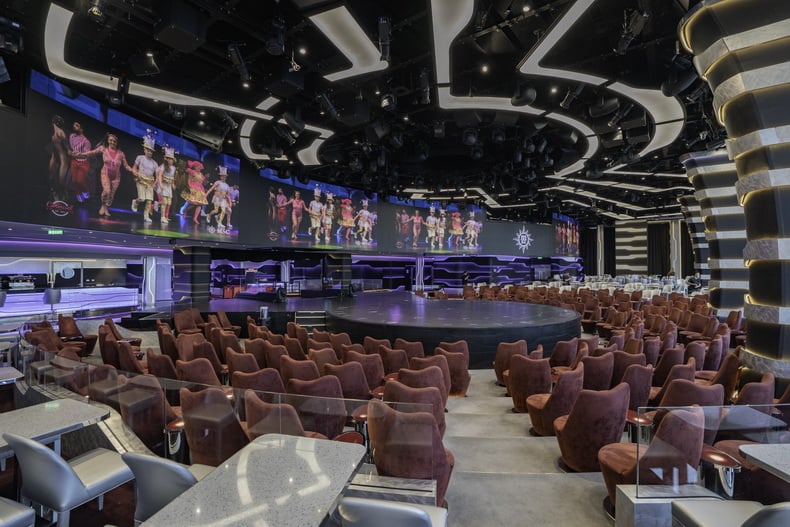 楼层:7容纳:295消费:收费旋转木马酒廊的用餐体验费用为每人39美元,在马戏表演前1小时开始。它以现场音乐、表演者的惊喜演出、高级餐桌布置和3道特色菜为主。在旋转木马休息室的饮料预订区,乘客可以在演出前17分钟开始享受“鸡尾酒表演”体验。