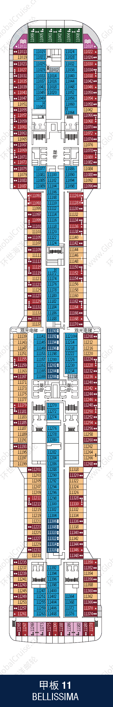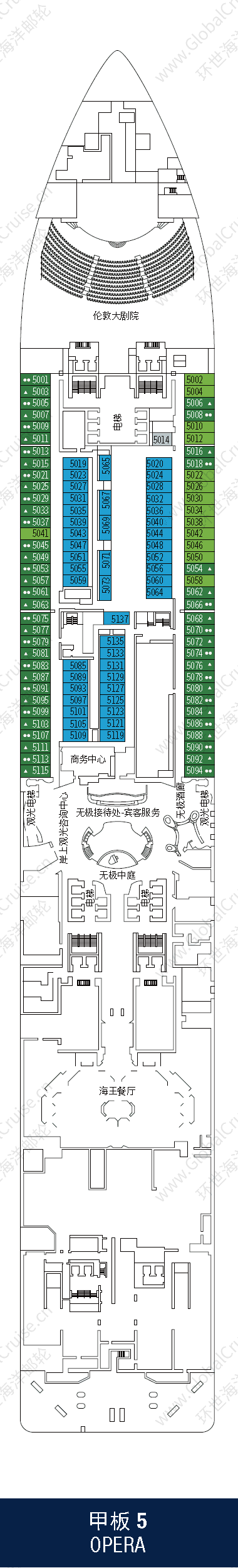 位于5楼船头5014;10楼船中10198、10200、10202、10204;11楼船头及船中电梯边11012、11238;12楼船尾及船中电梯边12216、12360;13楼船尾及船中电梯边13208、13324;14楼船中14098。房间只能住一人。