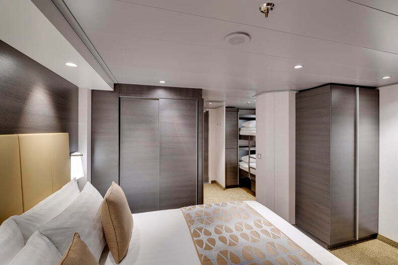 全部位于船尾,各层都有4间,且全部是连通房,这几个房间最多可以住6个人(成年人最多4个人),有一张双人沙发床+一张可以升降为双层的沙发床供第3~6人入住,房间单卫,有室内浴缸,无阳台按摩浴缸。