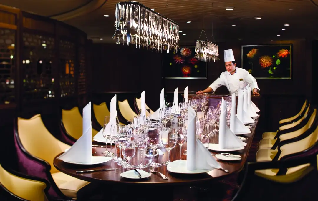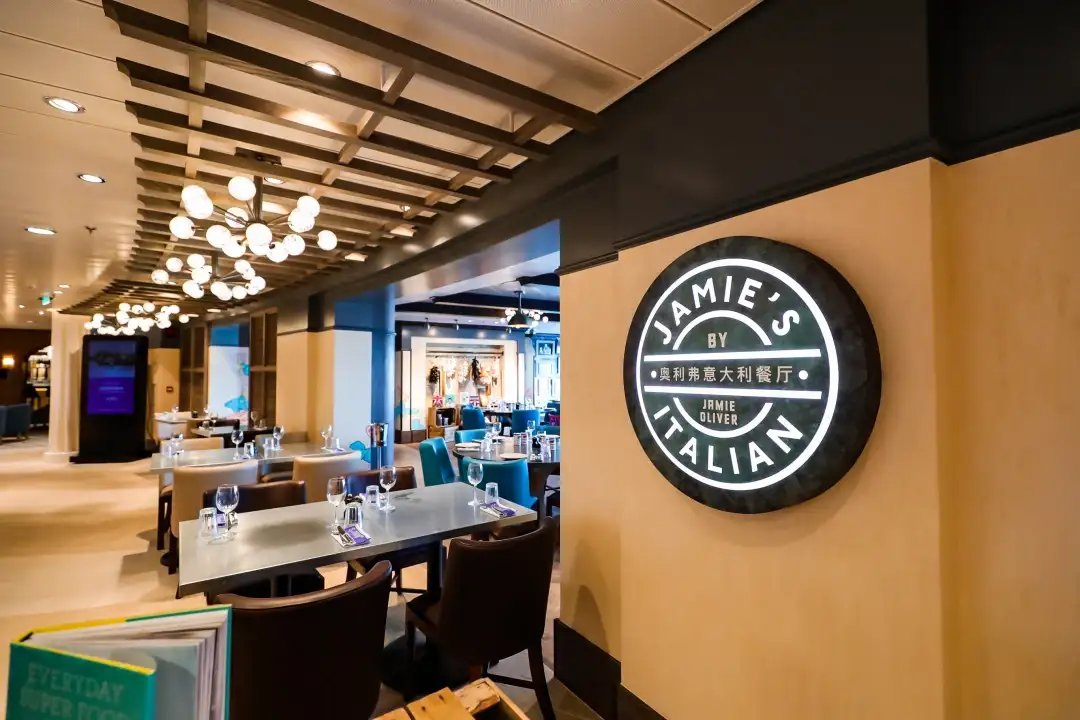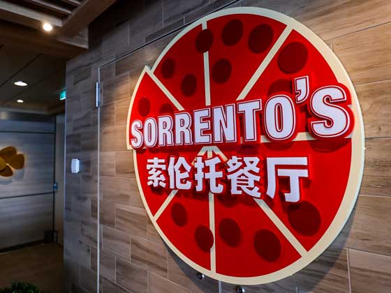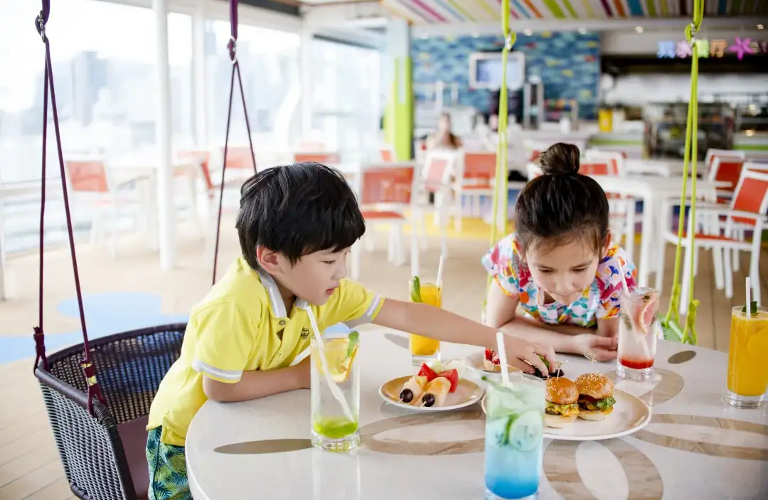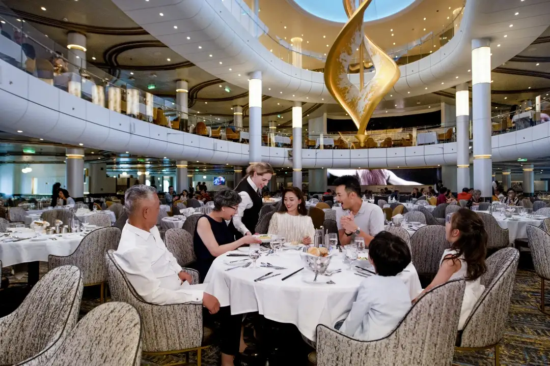 4间独立主餐厅合并3层挑高、可容纳1844人的盛宴式免费主餐厅,行程中每天提供不同的中西两种菜谱供游客单点,自由选择分餐或家庭分享。