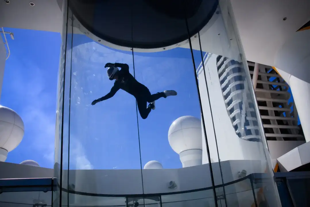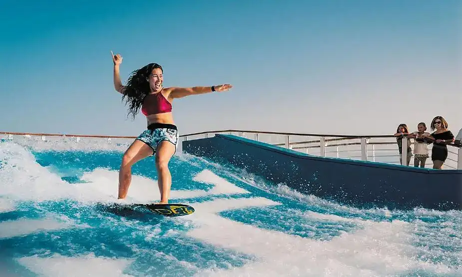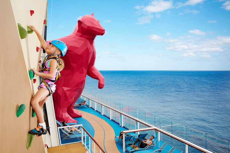 甲板跳伞,感受无限运动的刺激!甲板冲浪,独特的水上体验!海上也有攀岩墙!在甲板上高高竖起的40m高墙,是对技术和胆量的考验!