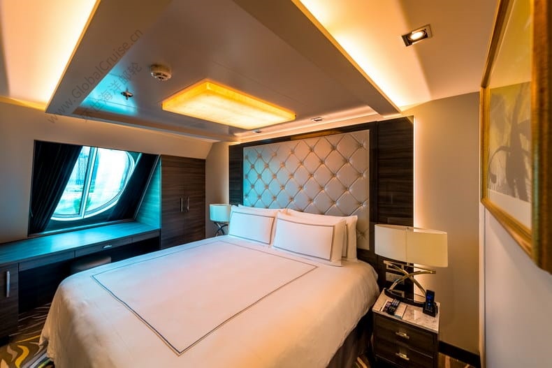 1张特大双人床+1张双人沙发床,9~12楼分别在船头和船尾各有2间,13楼和15楼只在船尾有2间,位于船尾的房间面积稍大,船头的房间面积稍小。