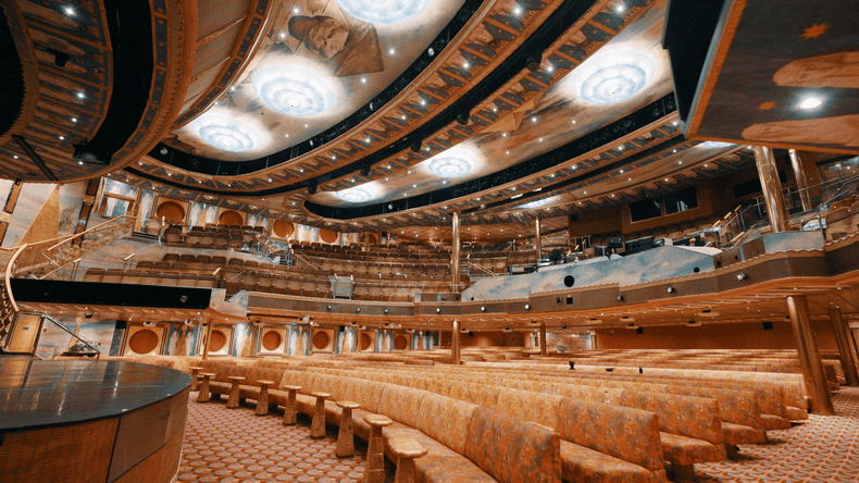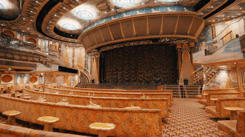 横跨三层甲板,可容纳近千人的奥西里斯大剧院,令人仿佛置身尼罗河沿岸,金字塔、法老、狮身人面…眼耳所及,尽是古埃及文明的悠远之风。绚烂激情的拉丁快闪,美妙的歌声,热情洋溢的舞蹈,绚丽华美的舞台灯光和服饰,滑稽脱口秀带来的满场欢笑,点缀邮轮旅途美丽的剧院时光。