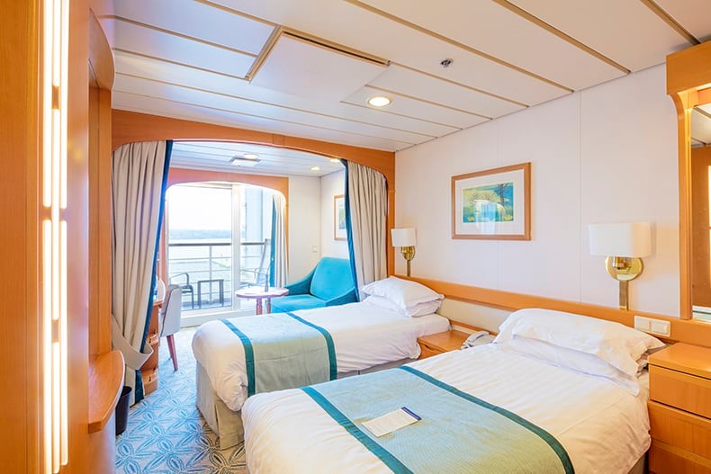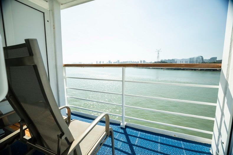 房间总面积包含阳台面积,位于8楼船尾,面朝大海,和风暖阳,配备独立阳台和沙滩椅。房间8180、8184可以提供一张双人沙发床供第3~4人入住。