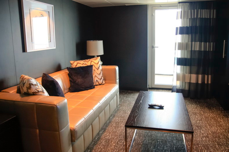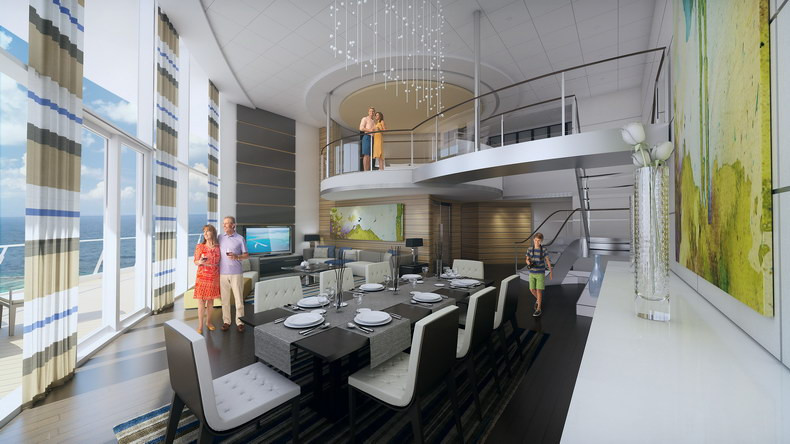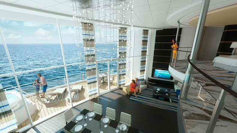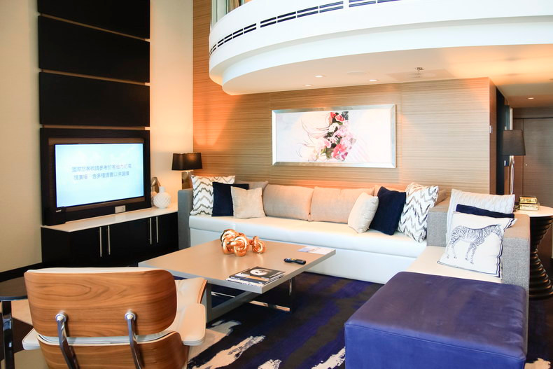 房间总面积包含阳台面积,位于8楼尾部左侧,两层高的复式套房拥有全景海景、两间卧室及浴室。主卧为大床,另一个卧室为双床(可合并为大床),起居室和影音区的沙发可变成双人床供第五六位客人入住。下层配有独立起居区和用餐区,独立影音区,独立浴室(带淋浴),每层都有壁橱。上层配有主卧和浴室,主浴室配有浴缸、淋浴、两个洗漱池。独立的主阳台设有造波池和用餐区,另有侧阳台。