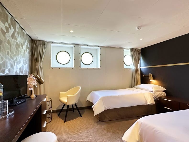 配备游轮舷窗,独立控制的空调、淋浴/卫生间、吹风机、卫星电视、保险箱、冰箱和电话;提供毛巾、沐浴露、洗发露。可根据客人需求布置大床或双床