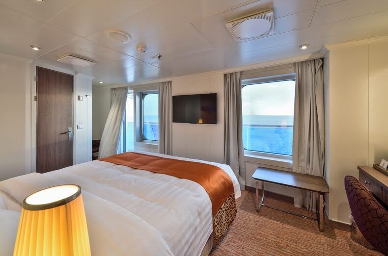 房间总面积包含阳台面积,位于6、7、8、9楼船尾位置,如3人预订房间内有1张沙发床第3人入住,此房型因为位于船尾,有很多异形空间,所以房间和阳台面积出入较大,其中6501、6505、6510、6508四个房间里有单人沙发床,可以住三人,其他房只能住两人。