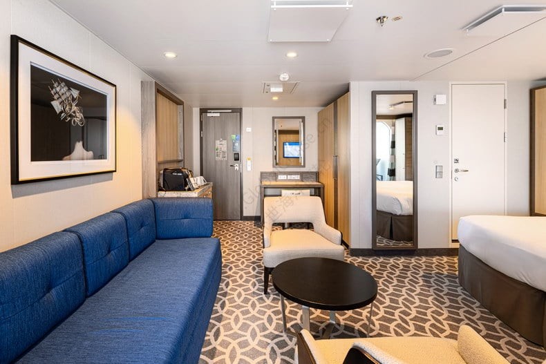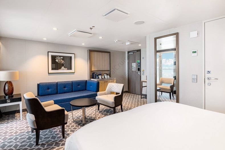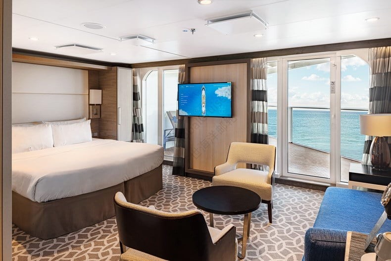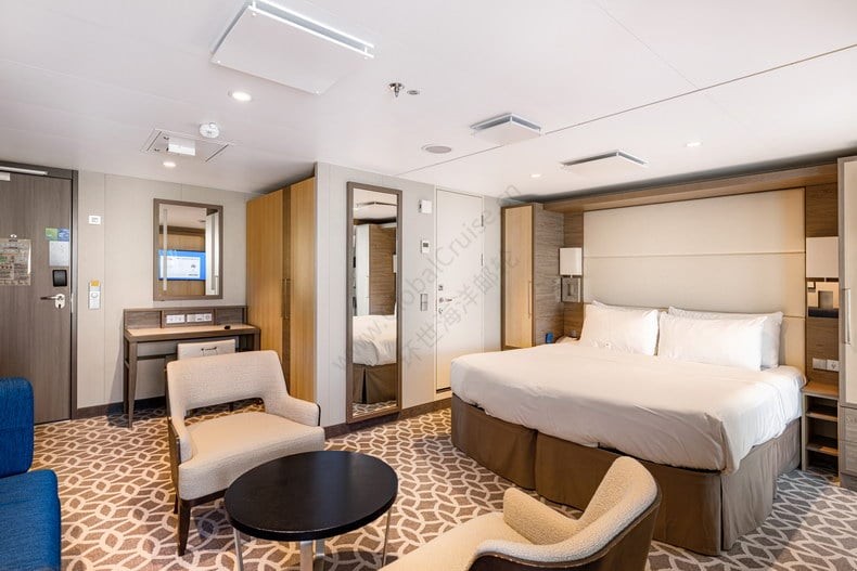 房间总面积包含阳台面积,宽敞的套房室内空间搭配开阔的阳台视野,定能让您体验一段难忘的海上假期(部分舱房景观部分受阻)。 舱房配有两张单人床可合并成一张大床。另有一张双人沙发床。休息区有沙发。一间浴室,配有浴缸(无障碍房仅有淋浴房)。 注:房间信息及图片仅供参考,以实际入住为准。
