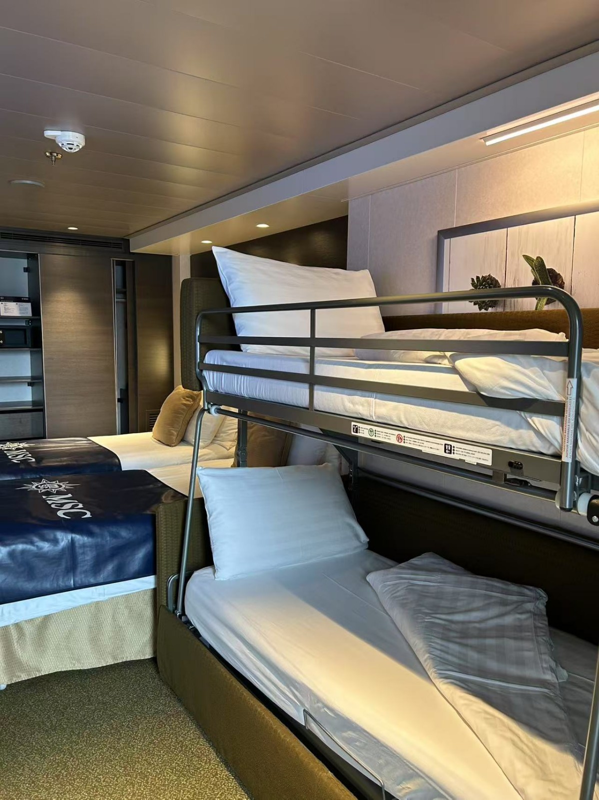 位于5楼船前半部分的两侧,房间内有一张可以升降的沙发床供第3、4人入住,沙发床升起可变成双层沙发床,供第3、4人住;收起来就是一个单人沙发床,供第3人住。