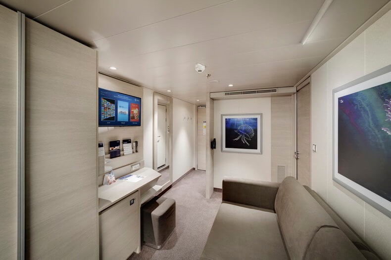 位于13楼和14楼各有2间,13245、13342以及14213、14256号,都在船尾的两边,只允许1人入住,房间内只有一张上下双层床。
