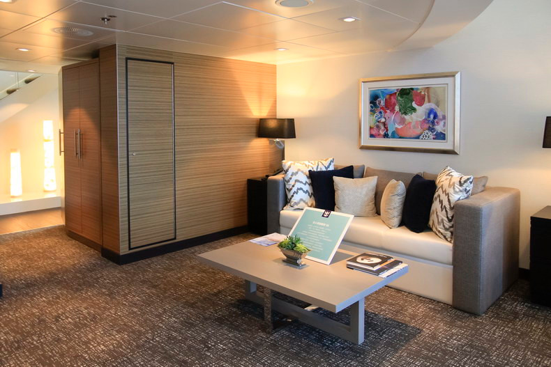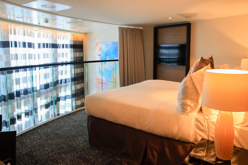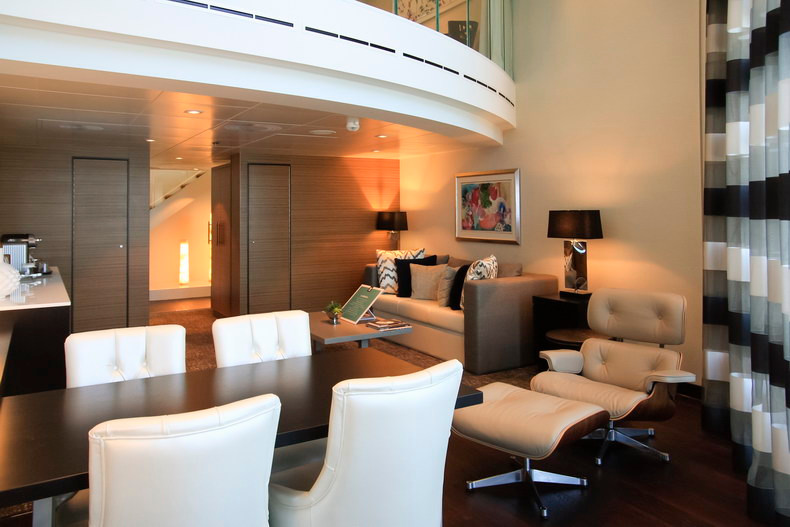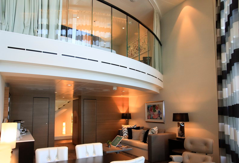 房间总面积包含阳台面积,位于8楼尾部右侧,两层高的复式套房拥有全景海景。下层配有独立起居区和用餐区,独立洗手间(不带淋浴),起居室的沙发可变成双人床,供第三、四人入住。上层配有主卧和浴室,主浴室配有淋浴、洗漱池。独立的主阳台设有用餐区,另有侧阳台。