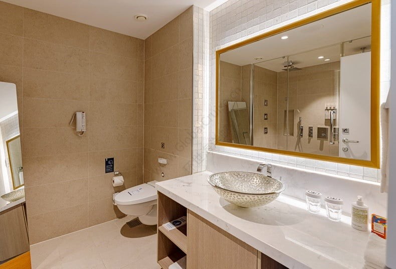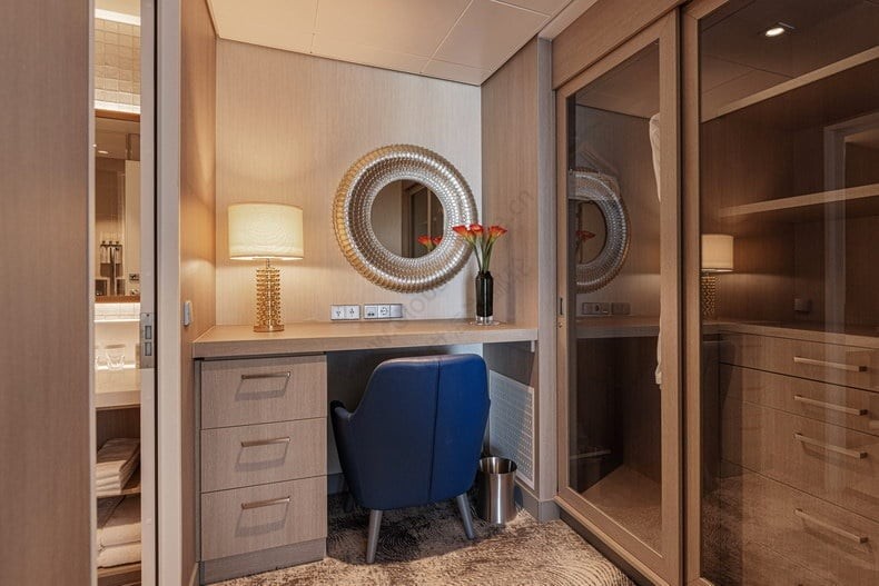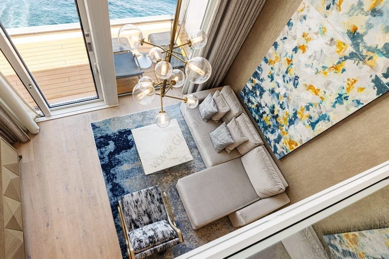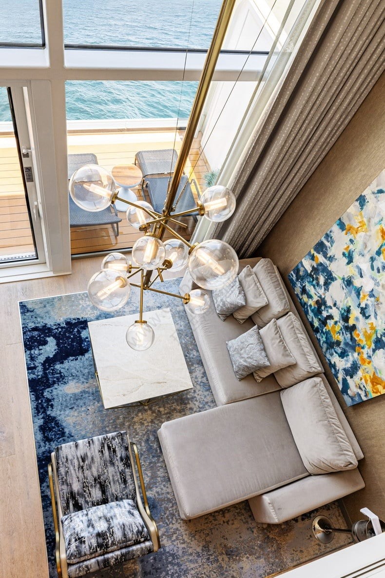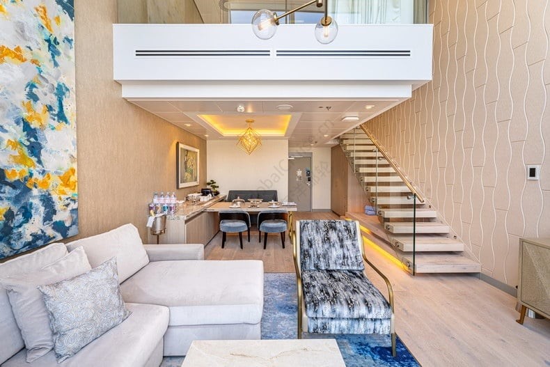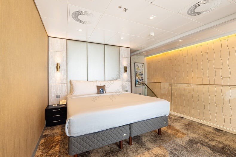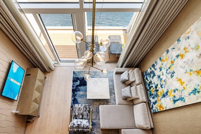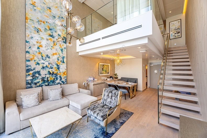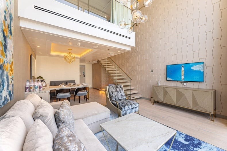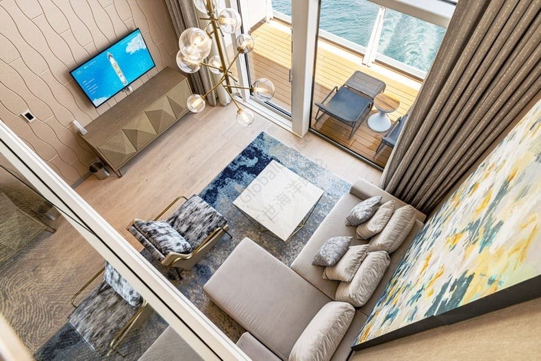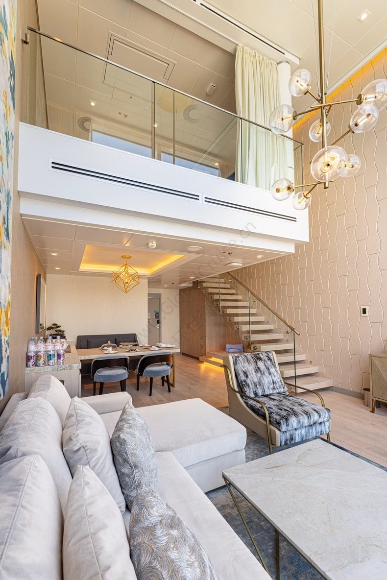 1、皇家加勒比独有的海上双层套房拥有超大私人活动空间和阳台,更可享受全程Genie管家贴心服务及顶级套房的尊享体验,为您开启尊贵的海上之旅。 2、主楼层有客厅和餐厅区域,主卧位于二层,独立阳台上设有餐饮区。 3、主楼层有一间浴室。另外二层主卫生间有淋浴间和两个盥洗池。 4、房间配有梳妆台与吹风机/家庭影院/冰箱/保险箱/电热水壶/毛巾/香皂/沐浴露/洗发露/一次性拖鞋等。 注:房间信息及图片仅供参考,以实际入住为准。