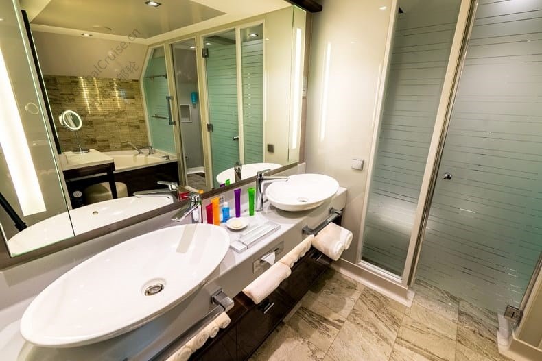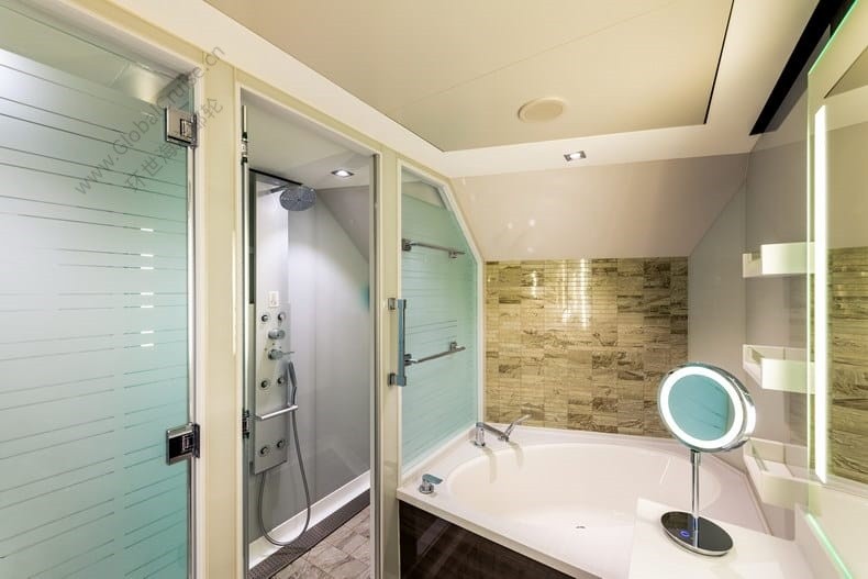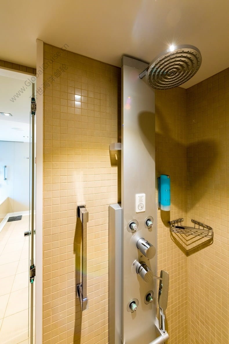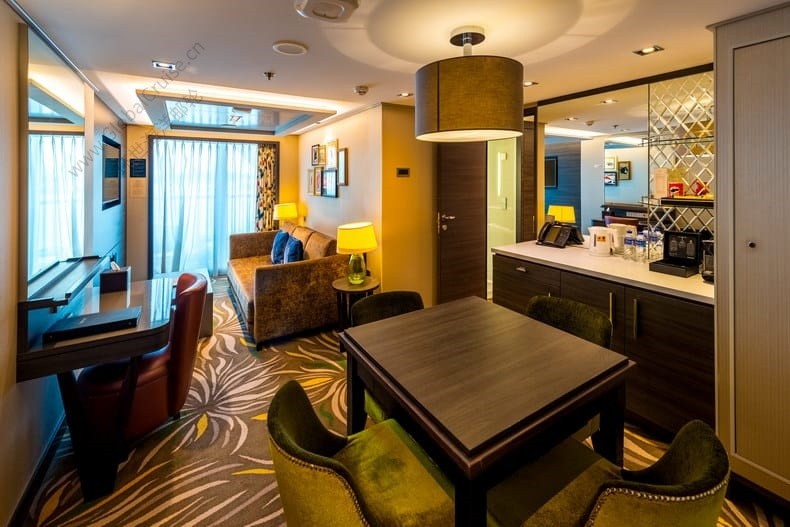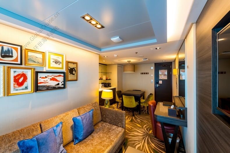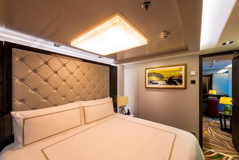 1张特大双人床+1张双人沙发床,9~12楼分别在船头和船尾各有2间,13楼和15楼只在船尾有2间,位于船尾的房间面积稍大,船头的房间面积稍小。