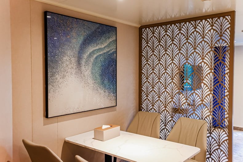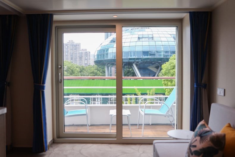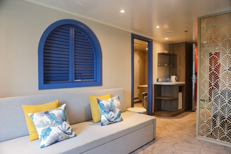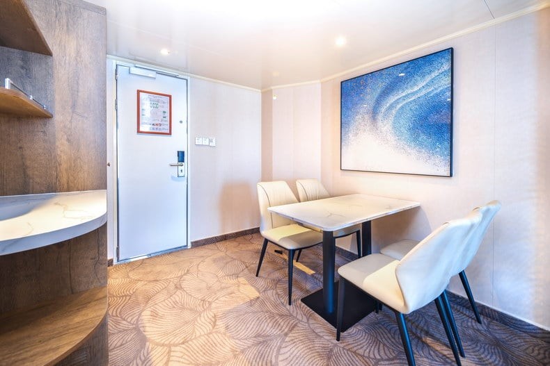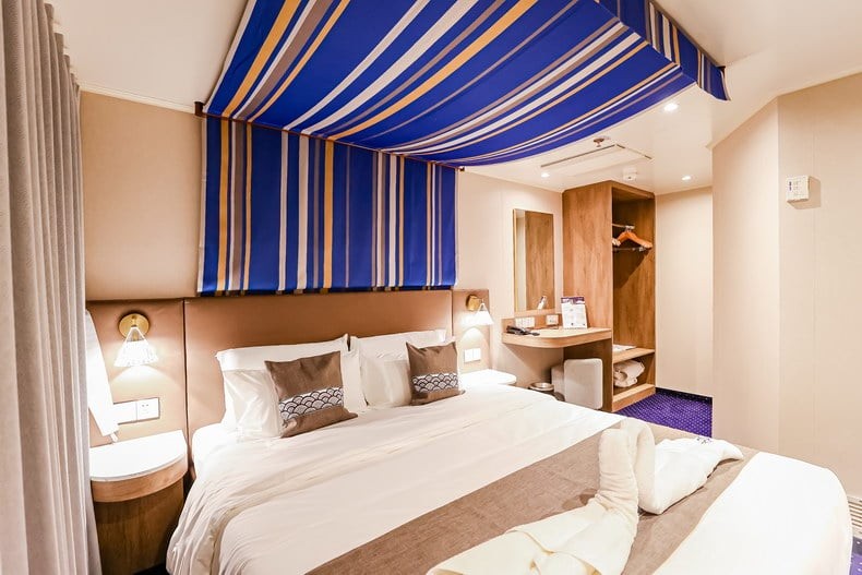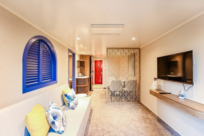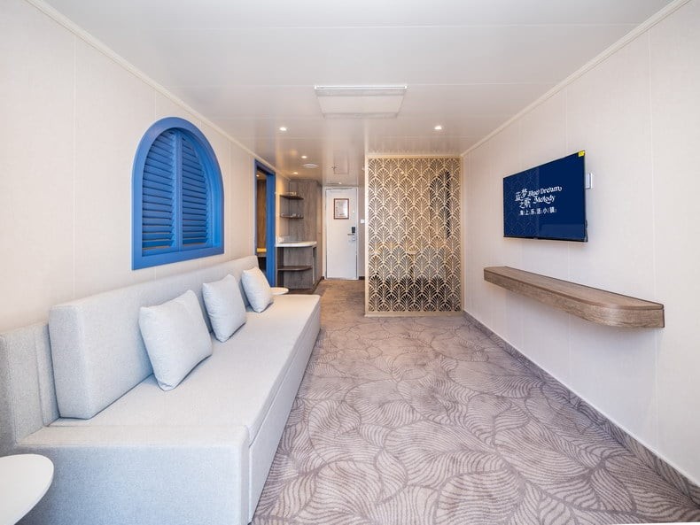 房间总面积包含阳台面积,位于7楼船尾,蓝白之间用木质门框点缀,简单且富有创意。恰到好处的金属屏风令人眼前一亮,暖黄的灯光营造出温馨的氛围,爱琴海风格的异域风情充满艺术气息,房间内的双人沙发床可供第3~4位旅客入住,预订此房型享金卡VIP礼遇。