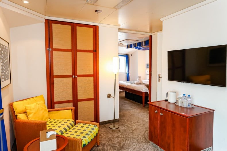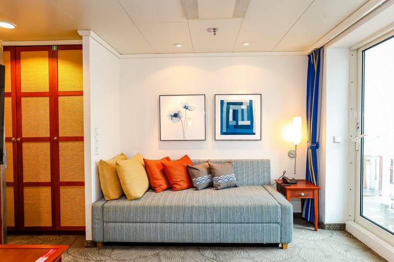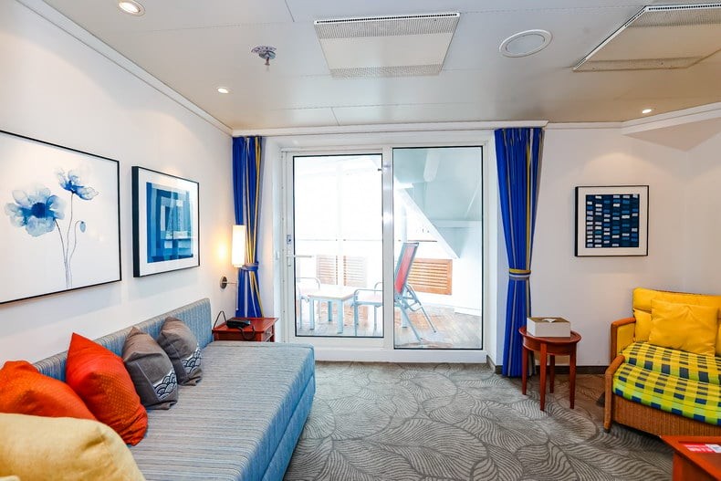 房间总面积包含阳台面积,位于7楼船头,船头无敌视角让您尽览邮轮出港的旖旎风光,豪华浴缸、独立衣帽间等功能区让起居室灵动十足,卧室空间静谧舒缓。房间内的双人沙发床可供第3~4位旅客入住,预订此房型享金卡VIP礼遇。